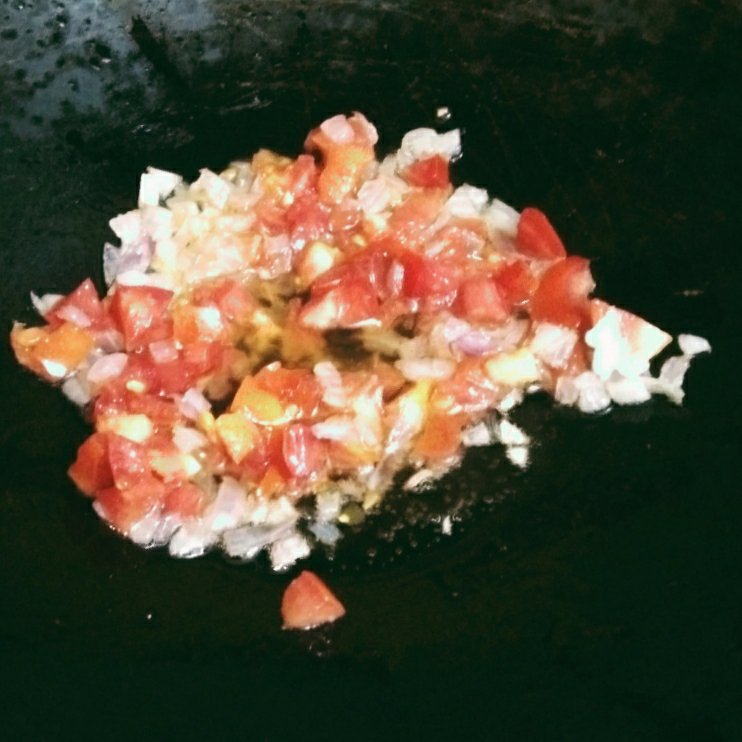 3. Then put the small pieces of a tomato in the pan. (Leave it for 2 mins.)